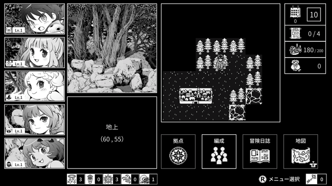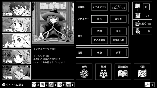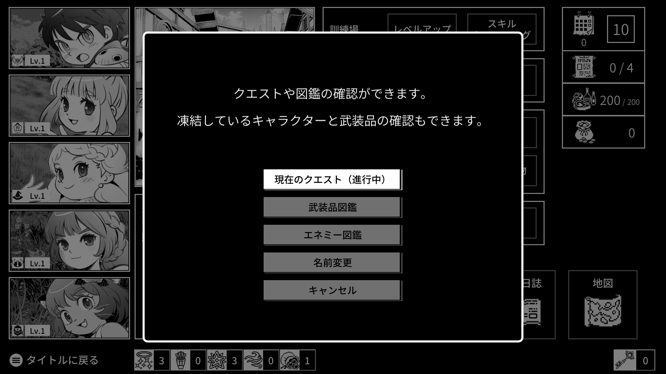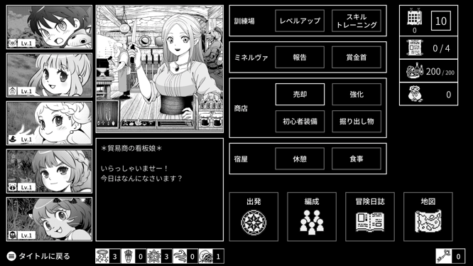 - ゲームは1日単位(拠点から出発して、拠点に帰還すると経過)で進行し、10日で1サイクルという単位で仕切り直されます。