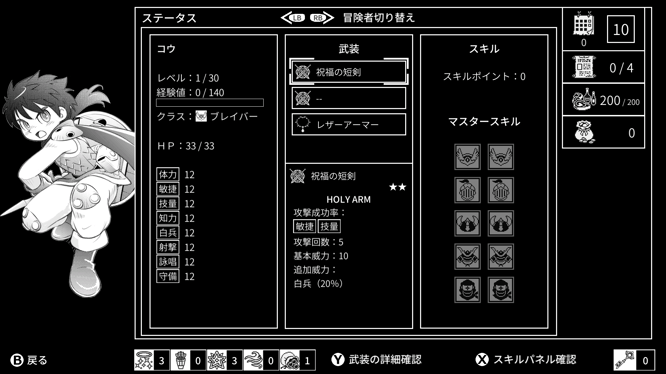 - ステータス画面では、名前、レベル、クラス、各種能力値などのほか、現在の装備状況、マスタースキルの獲得状況が確認できます。