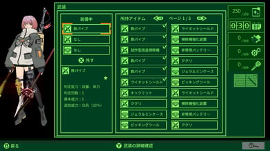 拠点での編成では、待機中のメンバーとパーティメンバーを交代させたり、それぞれの武装品を装備させたりすることができます。