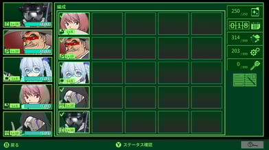 編成では、パーティメンバーを入れ替えたり、武装品を装備させたりできます。
